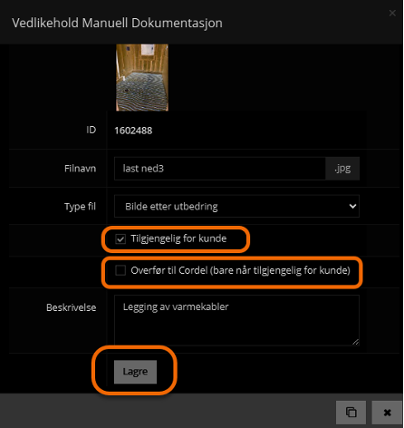 Huk av «tilgjengelig for kunde» og «Overfør til Cordel» trykk deretter Lagre – Oppdater dokumentasjon.