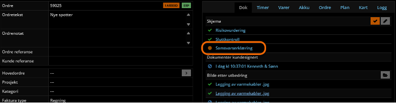 Gå inn på ordren og videre til samsvarserklæringen som krever ettergodkjenning (oransje sirkel):