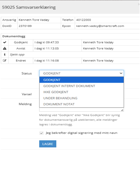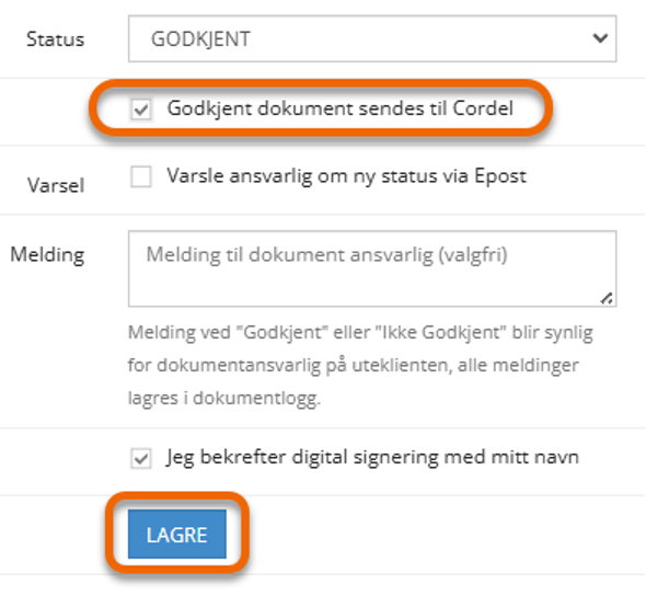 Når dokumentet godkjennes, kan det også sendes til Cordel ved å huke av Godkjent dokument sendes til Cordel.
